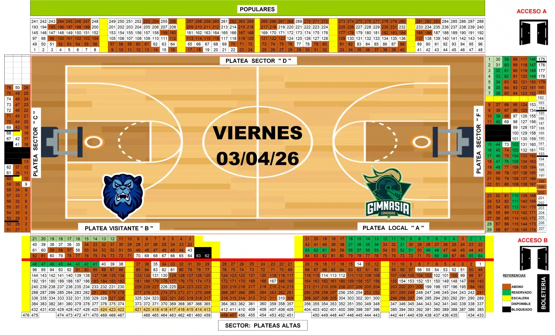 - Plateas incluyen todos los sectores numerados (A, B, C, D, F)